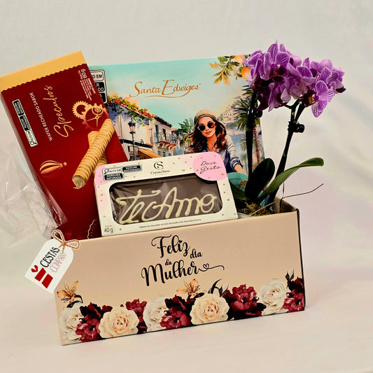 Cesta Feliz Dia da Mulher com Chocolates e Orquídea