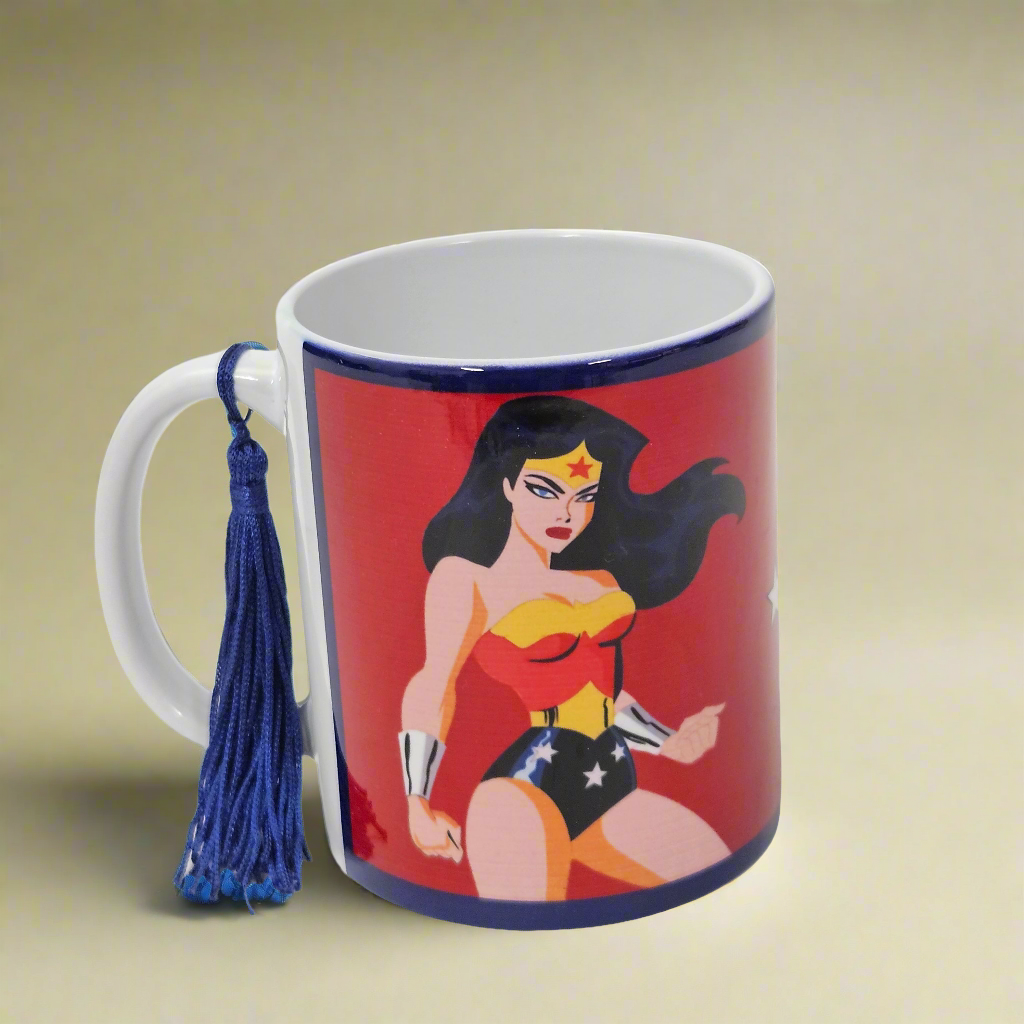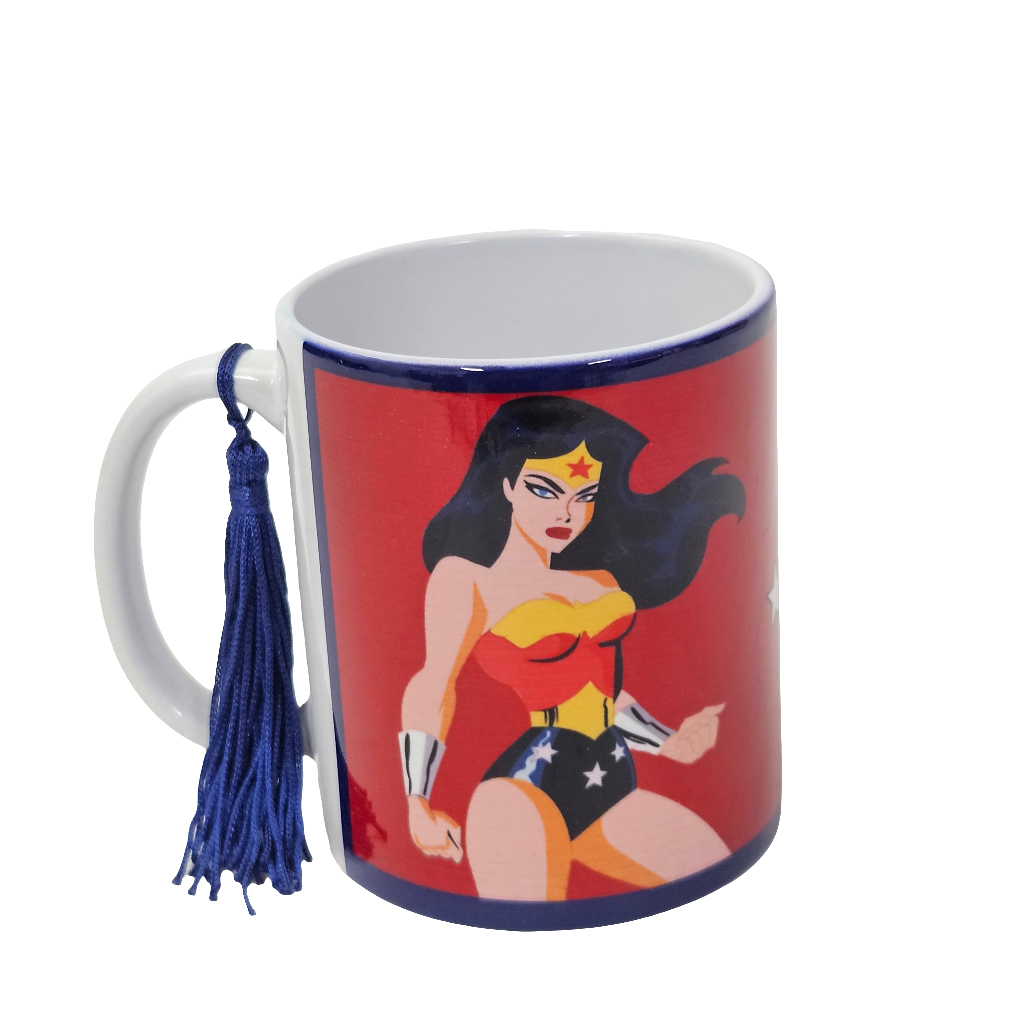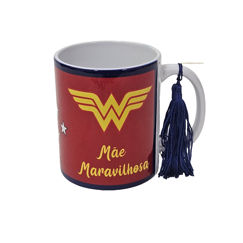 Para presentear a mamãe. Caneca ilustrada com ilustração de uma mulher maravilha de um lado e a inscrição "Mãe Maravilhosa" do outro.
