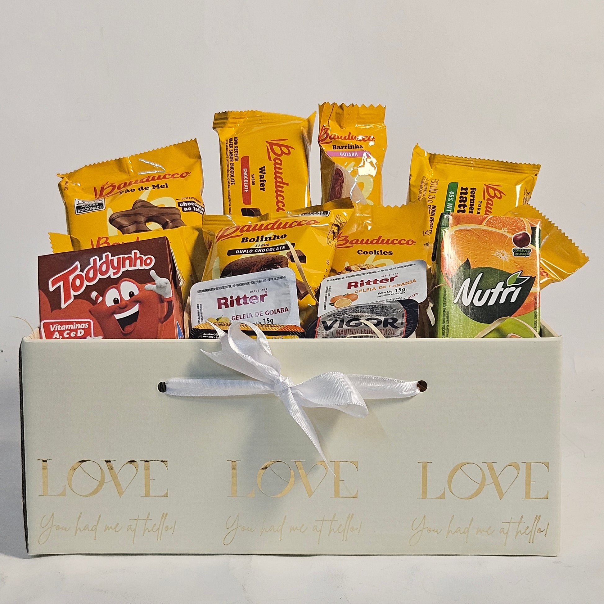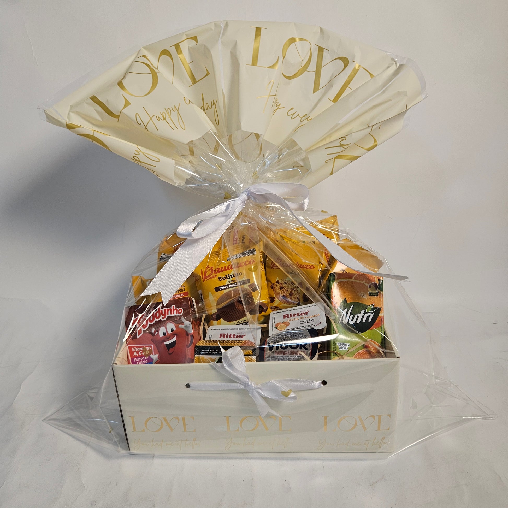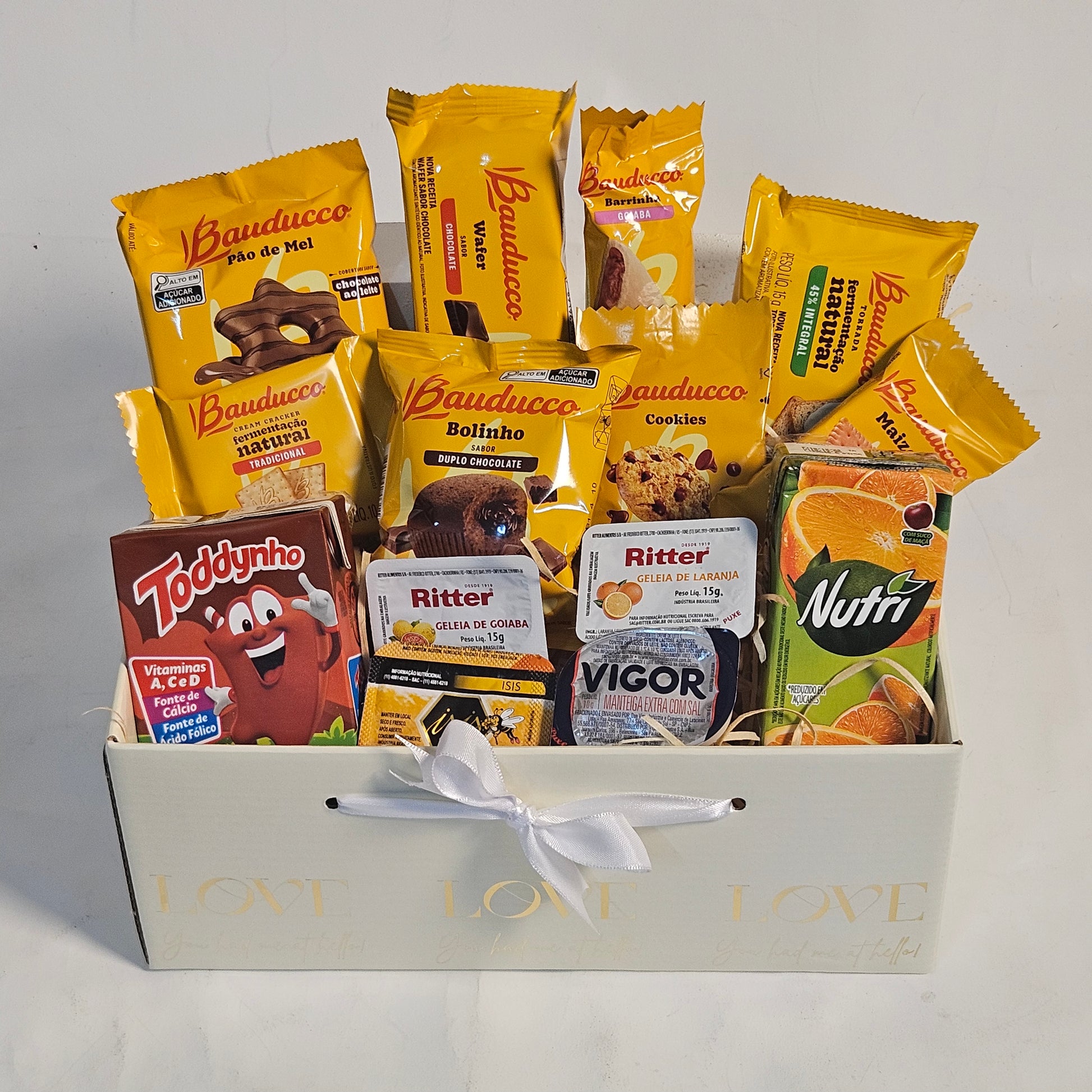 Cesta de regalo decorada que contiene: 1 Caja de Zumo de Frutas 200 ml, 1 Sobre de Capuchino Clásico 3 Corazones 20 g, 1 Pan de Miel Bauducco 30 g, 1 Barra de Cereales 22 g, 1 Bis Xtra Lacta 45 g, 1 Guayaba Bauducco 30 g, 1 Sobre de Té, Sobre de Azúcar, 1 Galleta Bel Vita 25 g , 2 galletas de desayuno de diferentes sabores desde 25g hasta 40g, de marcas como Bauducco, Seven Boys, Madeleine Paderri o WickBold, 1 paquete de galletas barquillo, un paquete de tostadas Bauducco, 1 galleta de 40g, 1 Zumo de manzana yakult 200ml