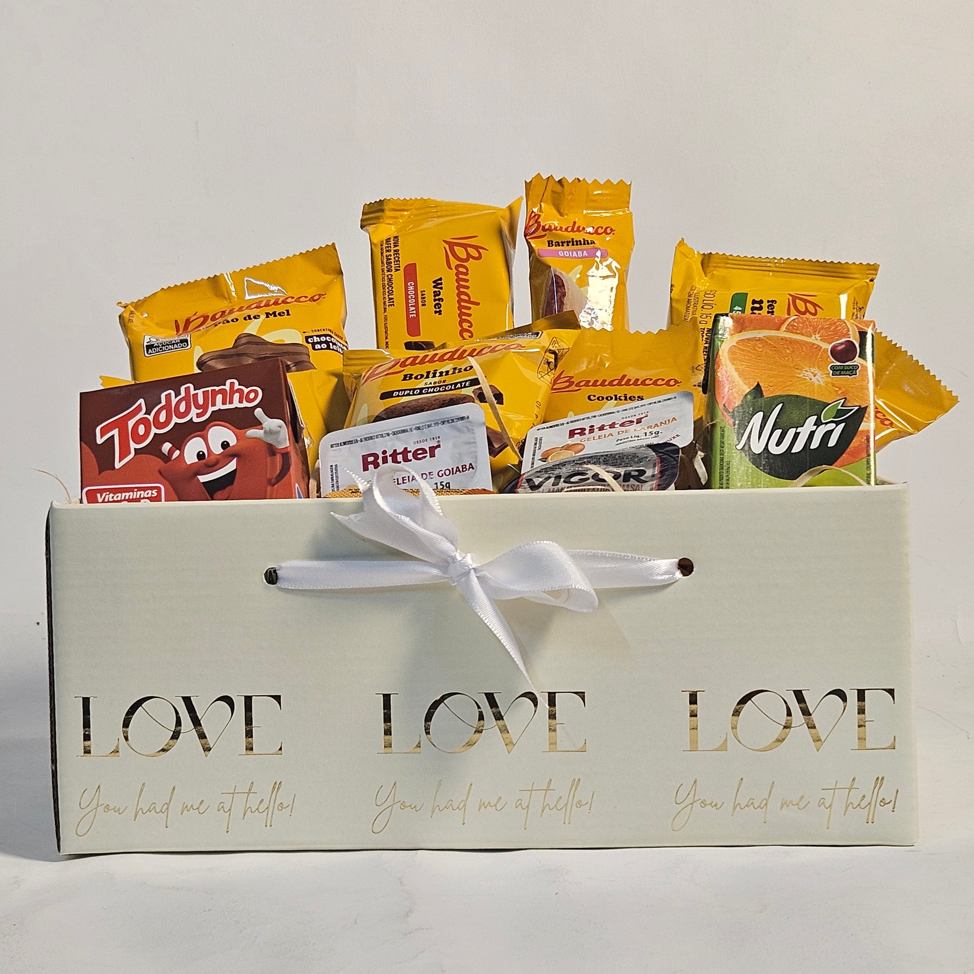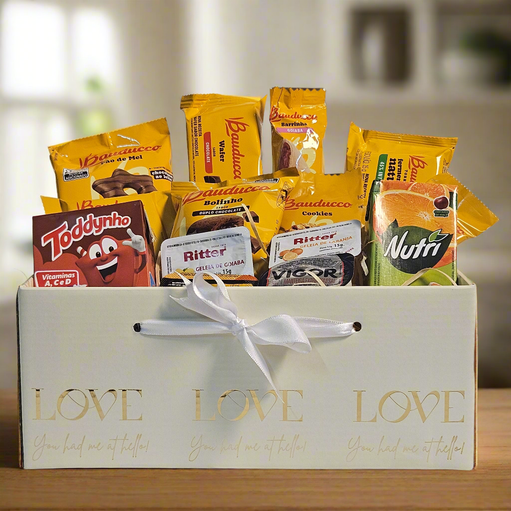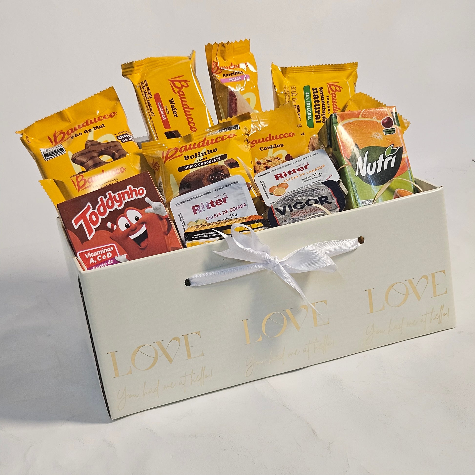 Cesta de regalo decorada que contiene: 1 Caja de Zumo de Frutas 200 ml, 1 Sobre de Capuchino Clásico 3 Corazones 20 g, 1 Pan de Miel Bauducco 30 g, 1 Barra de Cereales 22 g, 1 Bis Xtra Lacta 45 g, 1 Guayaba Bauducco 30 g, 1 Sobre de Té, Sobre de Azúcar, 1 Galleta Bel Vita 25 g , 2 galletas de desayuno de diferentes sabores desde 25g hasta 40g, de marcas como Bauducco, Seven Boys, Madeleine Paderri o WickBold, 1 paquete de galletas barquillo, un paquete de tostadas Bauducco, 1 galleta de 40g, 1 Zumo de manzana yakult 200ml