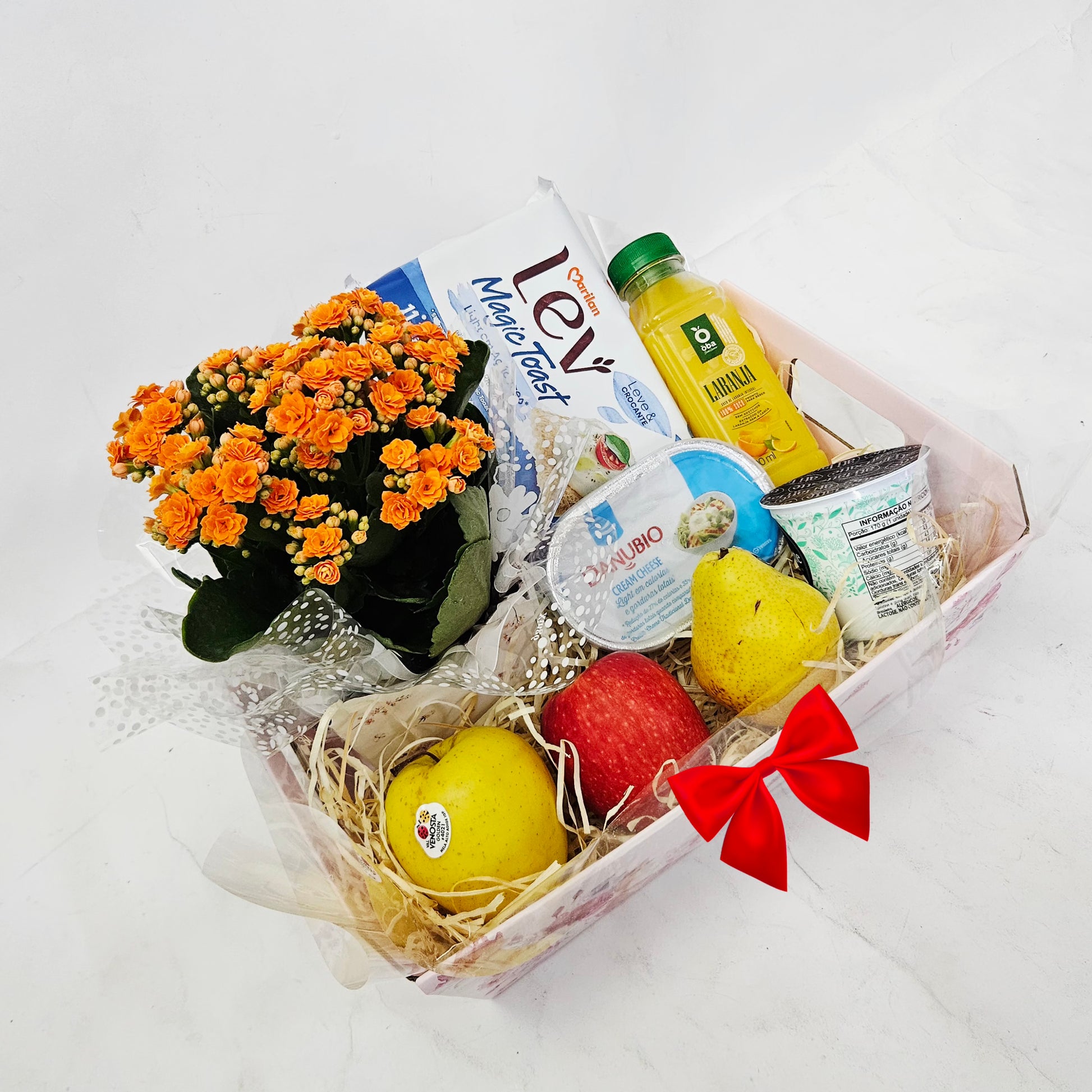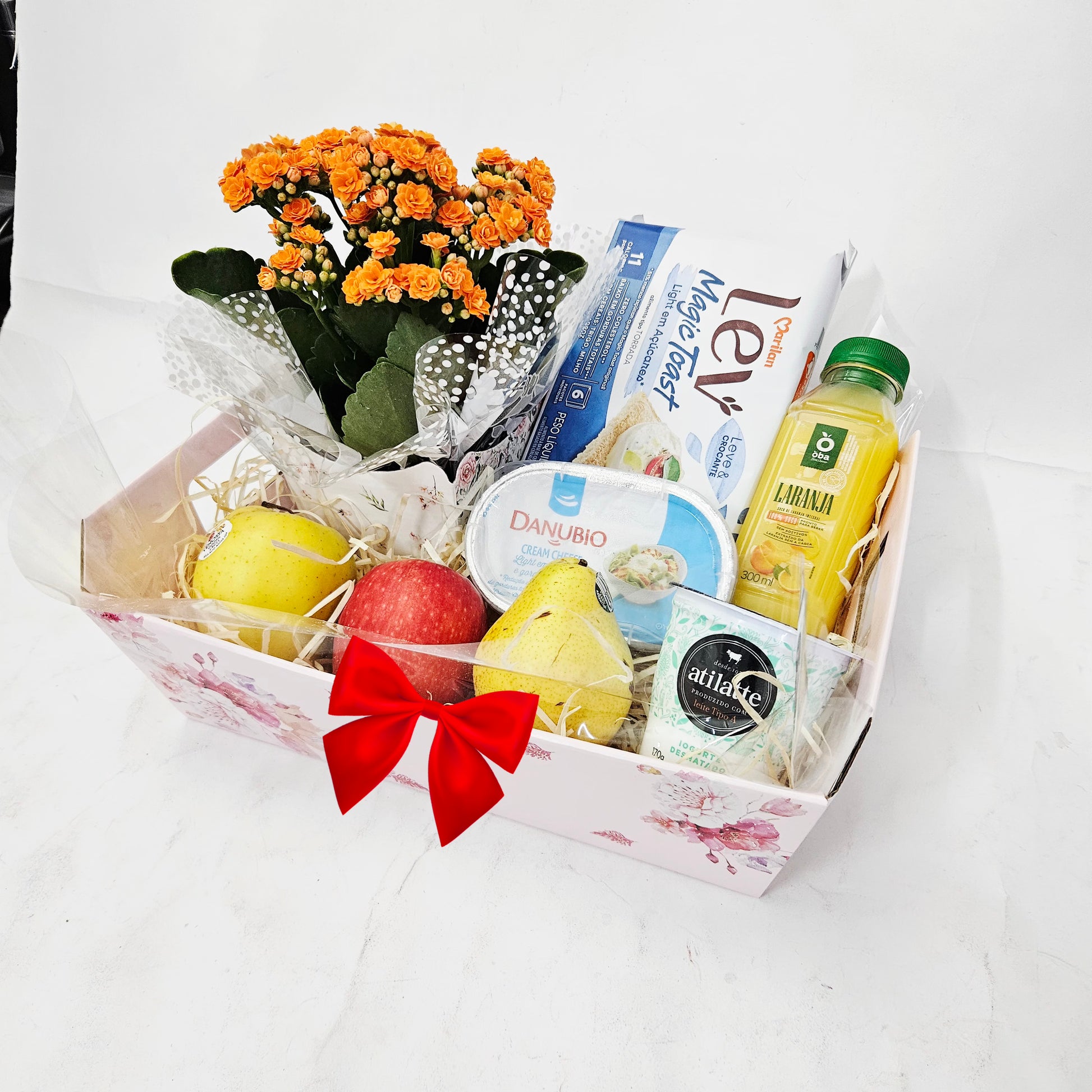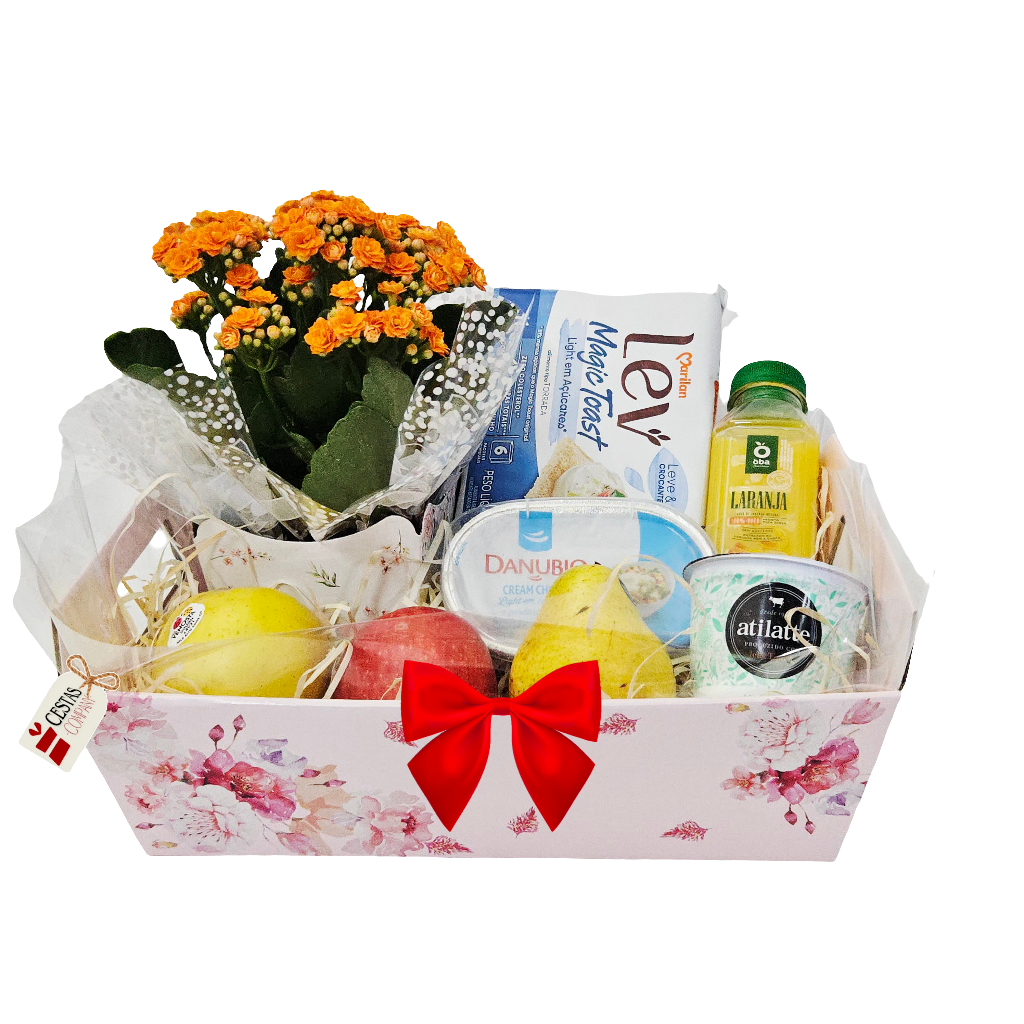 Cesta de regalo decorada, que contiene: 1 Café Soluble Lór Intenso 40g , 1 Queso Crema 150g Light, 1 Tost Slim Light 110g, 3 Frutas Seleccionadas, 1 Caja de Té CERO CALORÍAS, 1 Yogur Natural 170g Light (Leitissimo o Atilatte), 1 Zumo de Naranja Jugo 100% 300ml, 1 Bote de Kalanchoe.