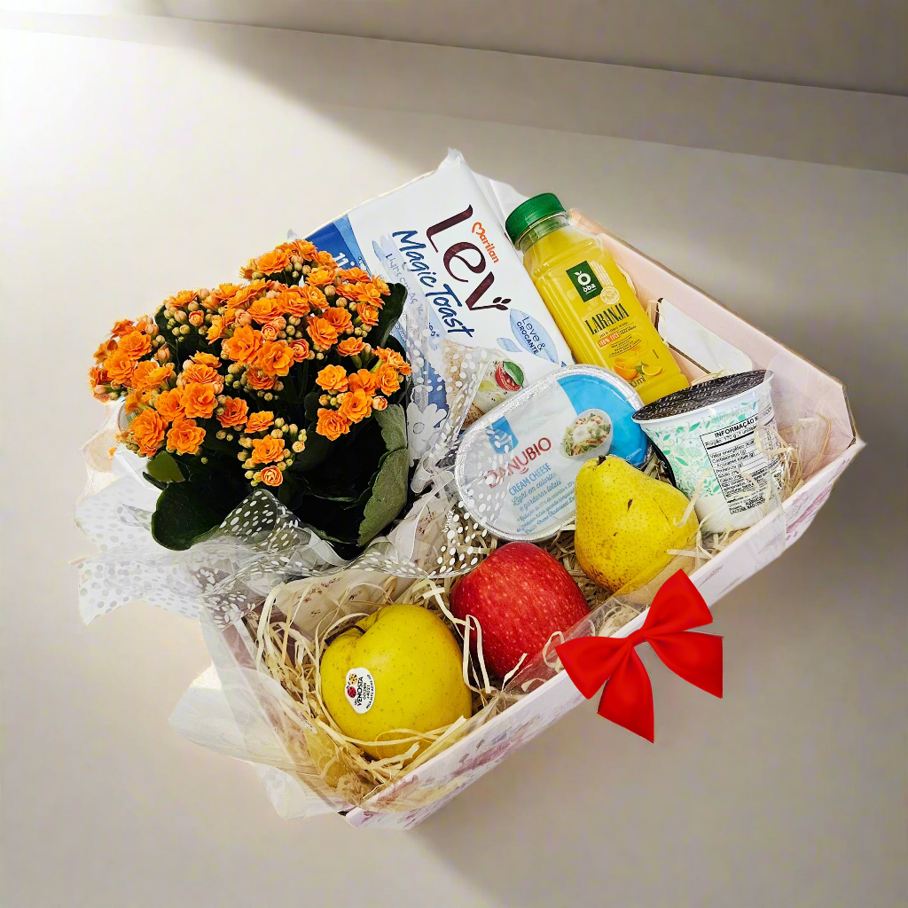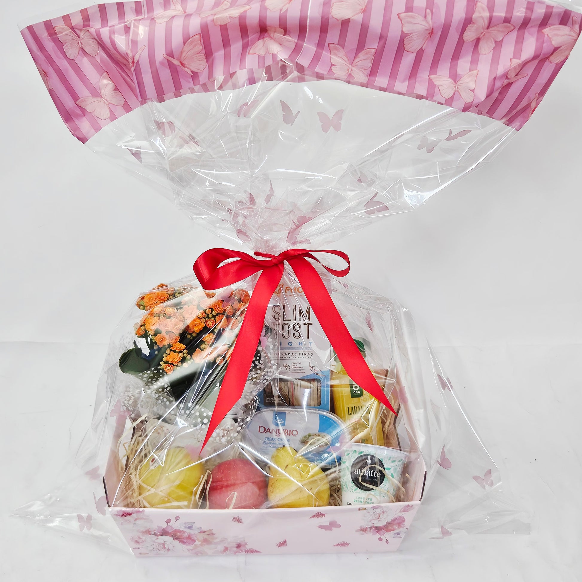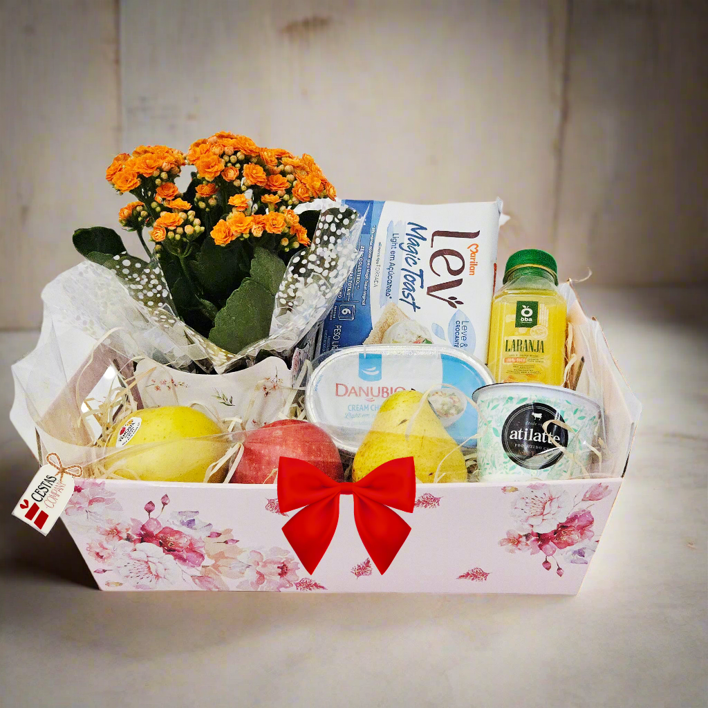 Cesta de regalo decorada, que contiene: 1 Café Soluble Lór Intenso 40g , 1 Queso Crema 150g Light, 1 Tost Slim Light 110g, 3 Frutas Seleccionadas, 1 Caja de Té CERO CALORÍAS, 1 Yogur Natural 170g Light (Leitissimo o Atilatte), 1 Zumo de Naranja Jugo 100% 300ml, 1 Bote de Kalanchoe.