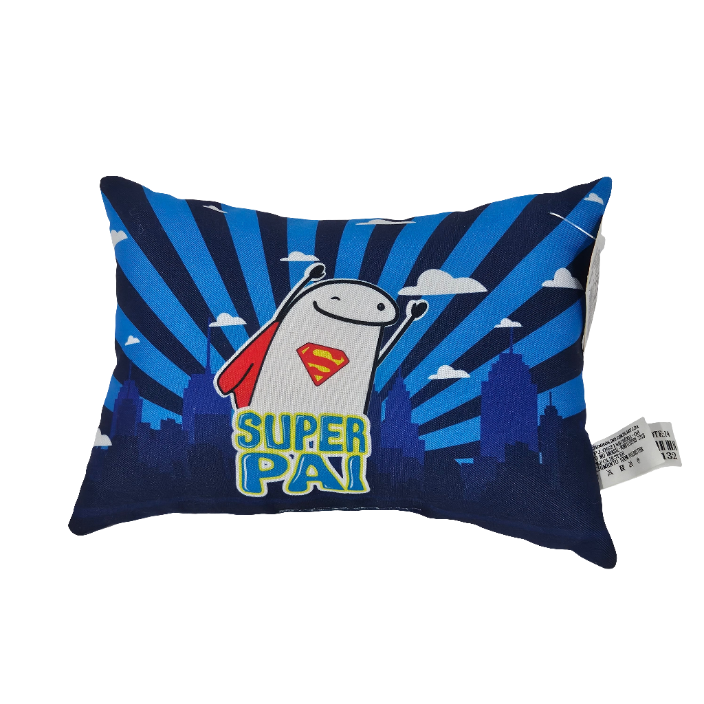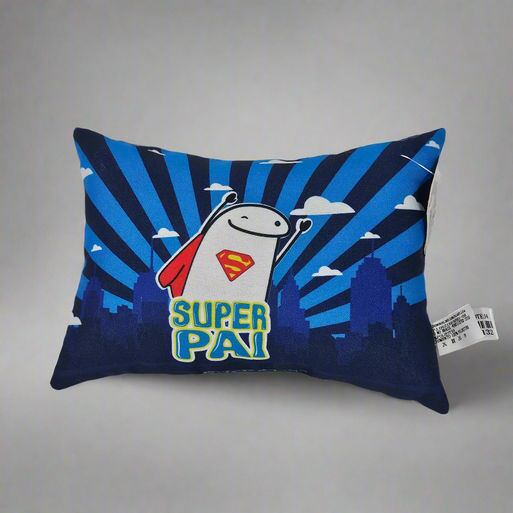 Almofada com a inscrição "Super Pai" de um lado e do outro lado "Quem tem um super paizão tem tudo desde sempre" Tamanho aproximado: 24cm x 13 cm.