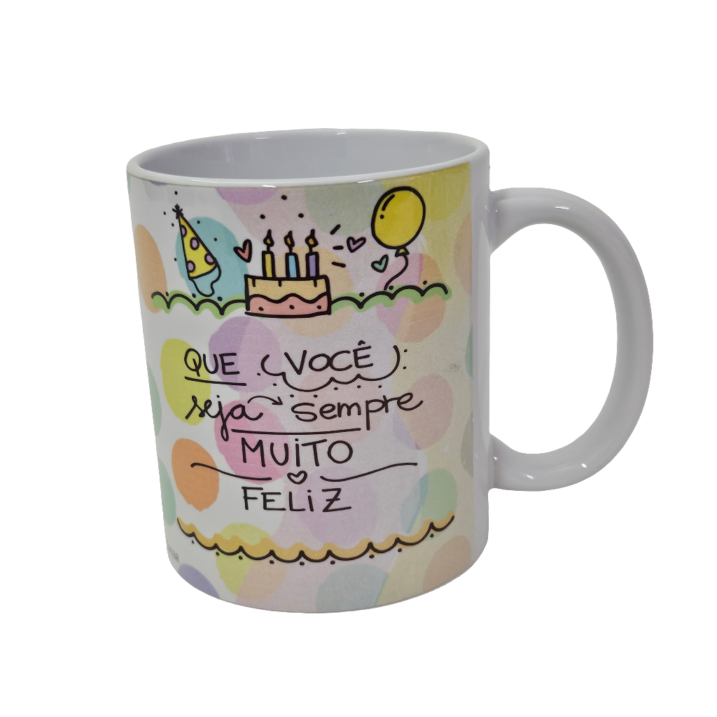 Para presentear aniversariantes especiais. Caneca ilustrada com motivos festivos e a inscrição "Parabéns pelo teu Aniversário!" de um lado e "Que você seja sempre Muito Feliz" do outro.