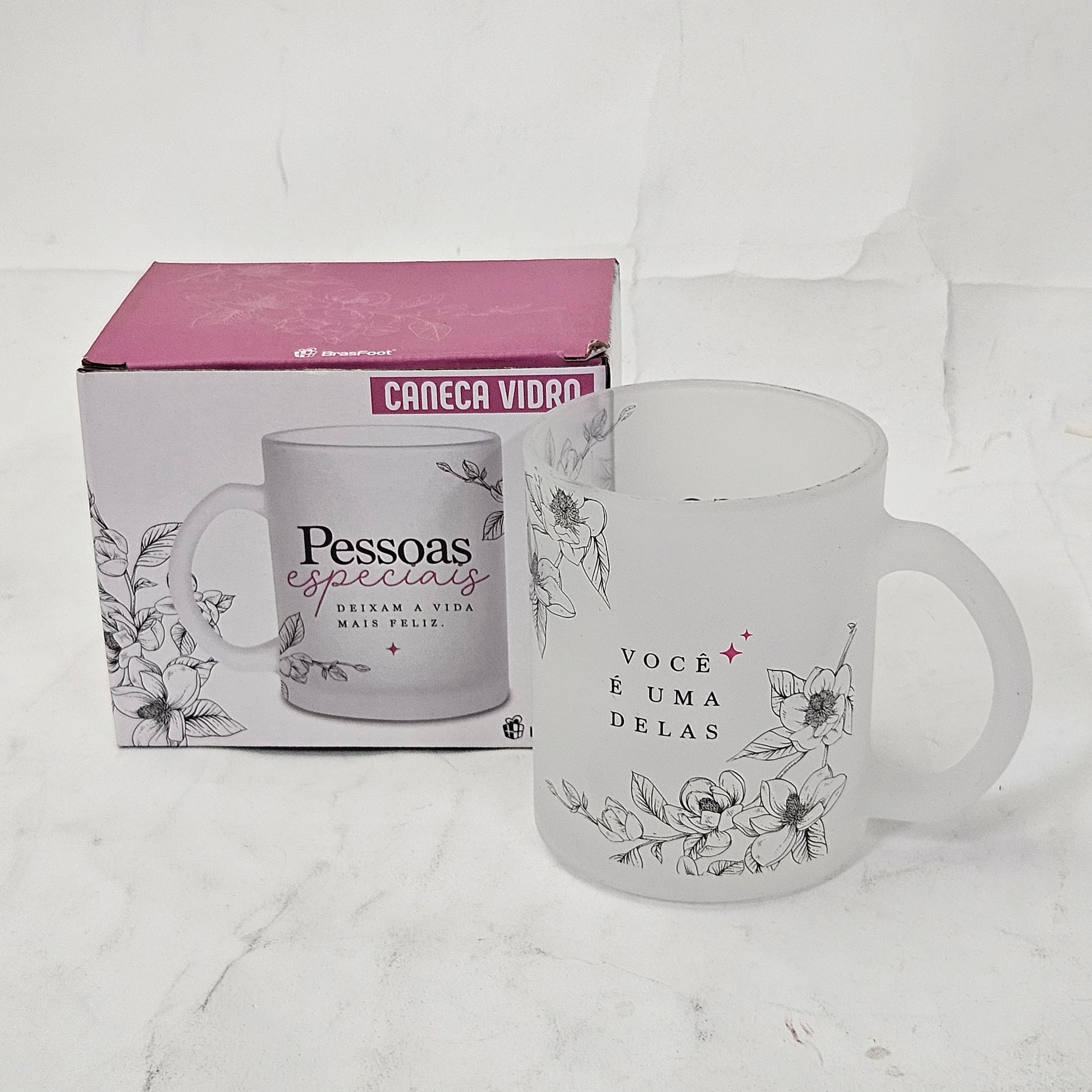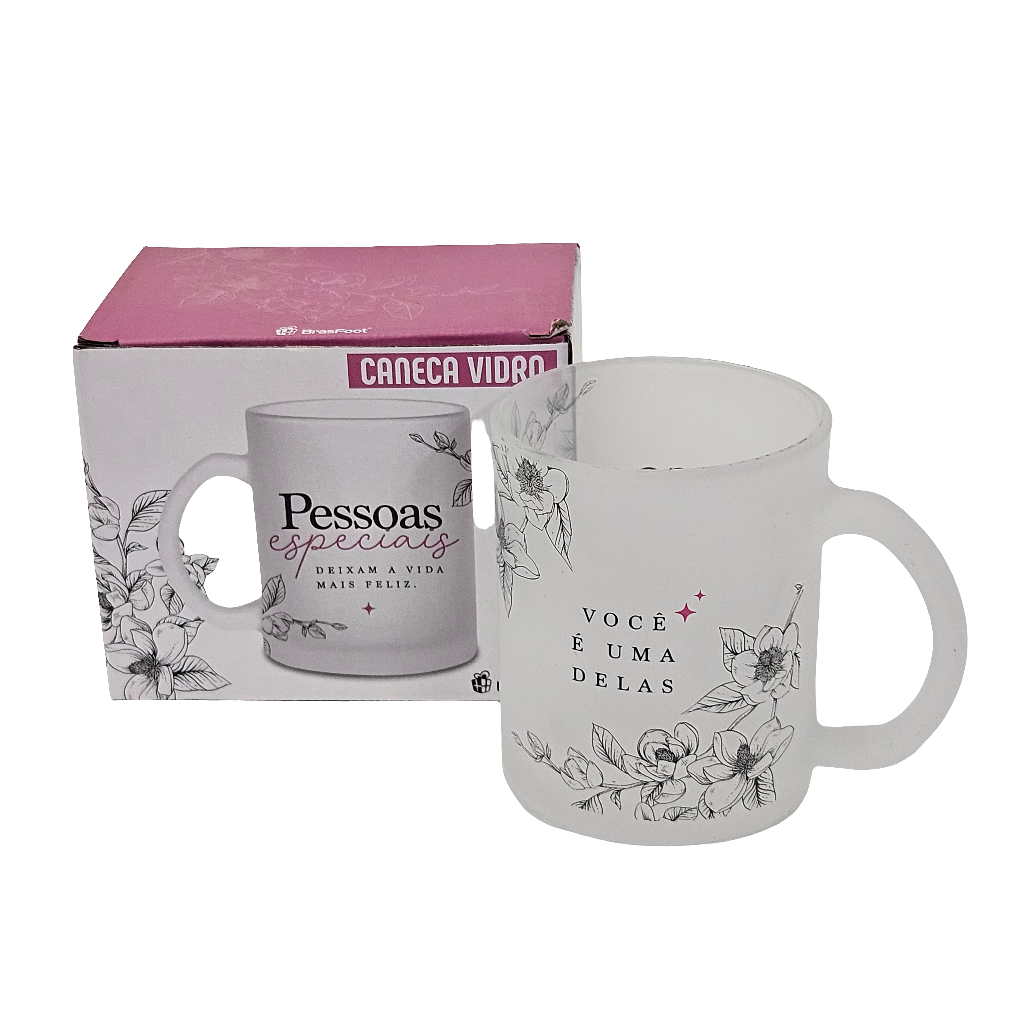 Uma caneca de vidro jateada linda, durável e uma ótima opção para presentear. Capacidade: 300 ml