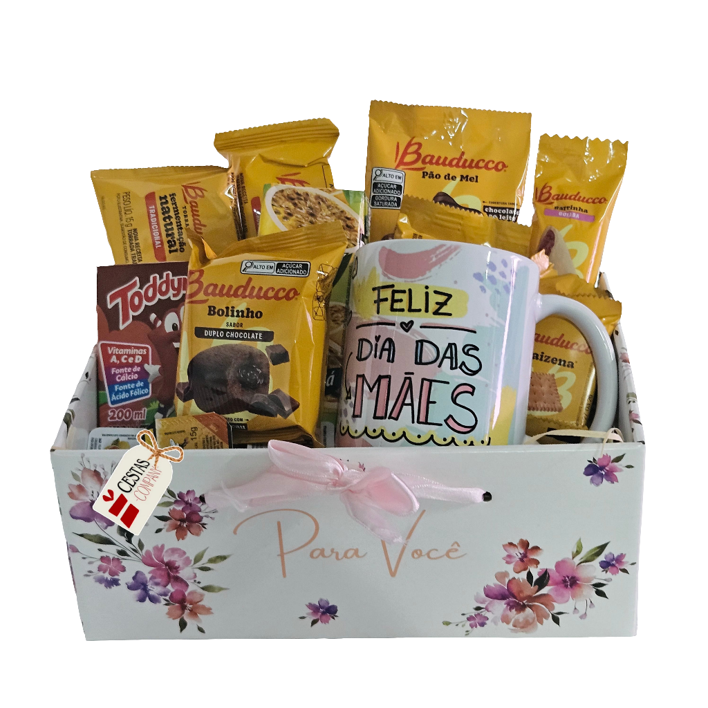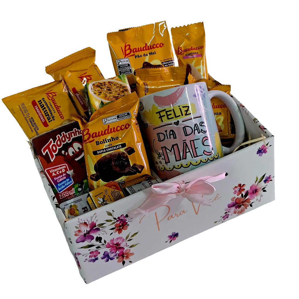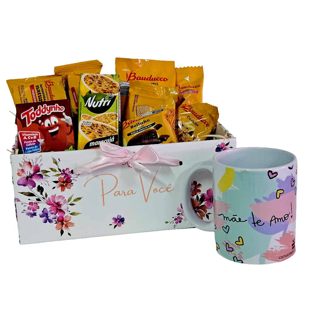 A Cesta Café da Manhã com Caneca Feliz Dia das Mães é um presente especial e carinhoso para o Dia das Mães. Um cesta com estampa florida com a inscrição "Pra Você" cuidadosamente decorada e embalada contendo itens selecionados para um café da manhã e/ou um lanche da tarde completo e saboroso.