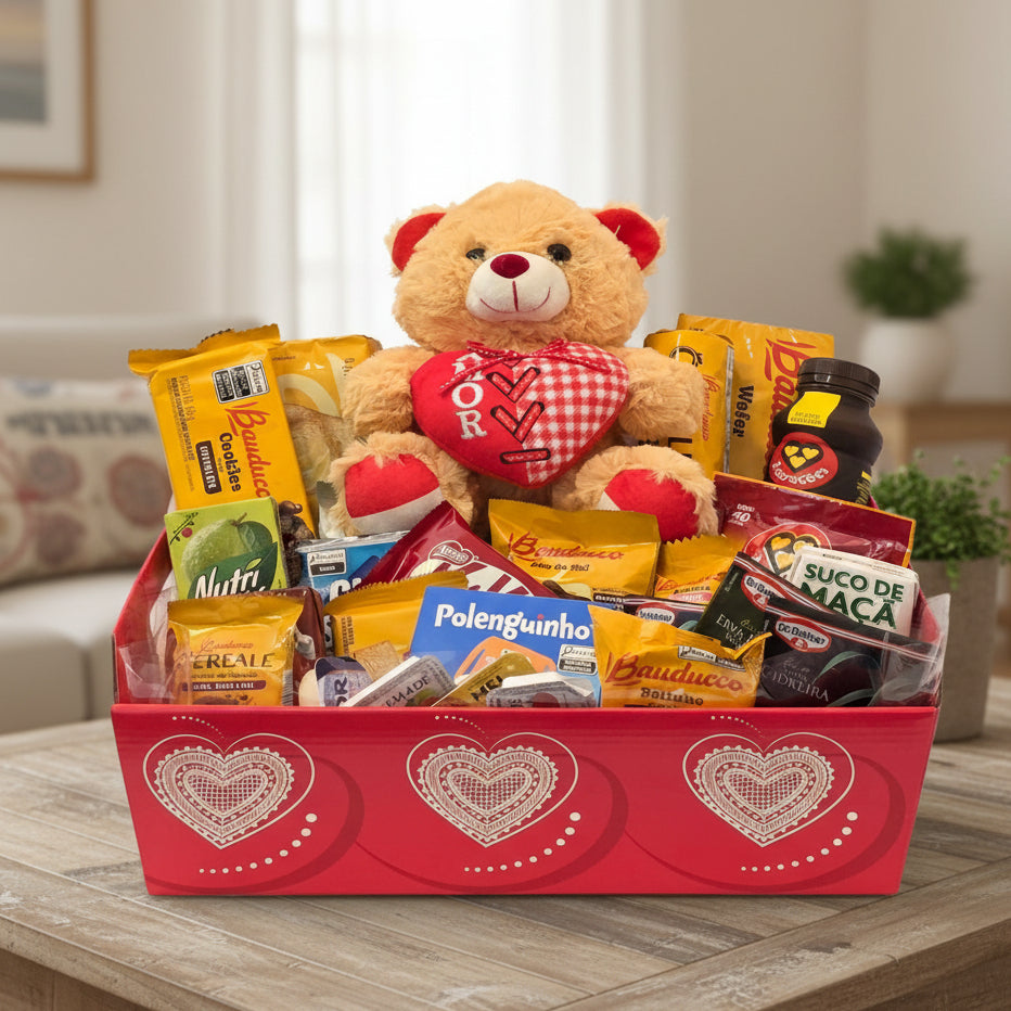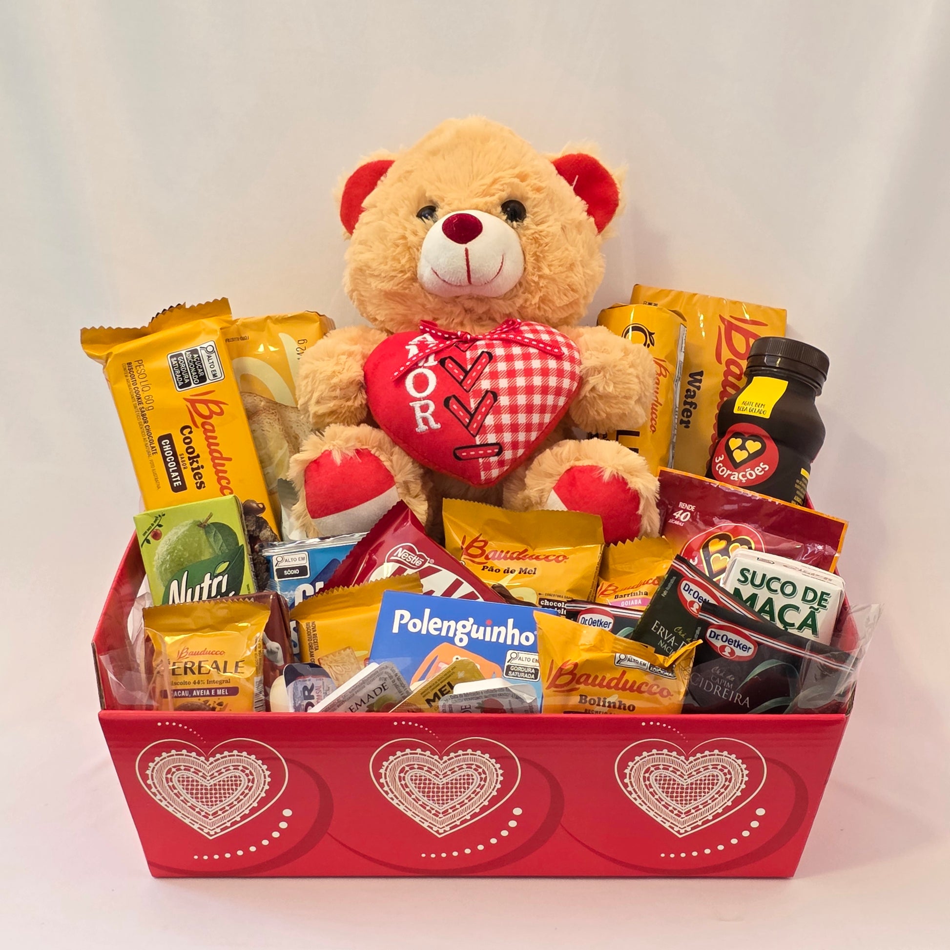 Quer enviar um presente romântico em uma data especial? Que tal esta linda cesta de café da manhã com um apaixonante ursinho de pelúcia segurando um coração com a inscrição "Amor"? Surpreenda e envie sua mensagem de carinho com um presente que fala direto ao coração! Esta cesta está disponível para entrega em todos os Bairros de São Paulo e em algumas cidades próximas. Veja disponibilidade ao informar o endereço de entrega. Aproveite para agendar hoje esta surpresa encantadora!