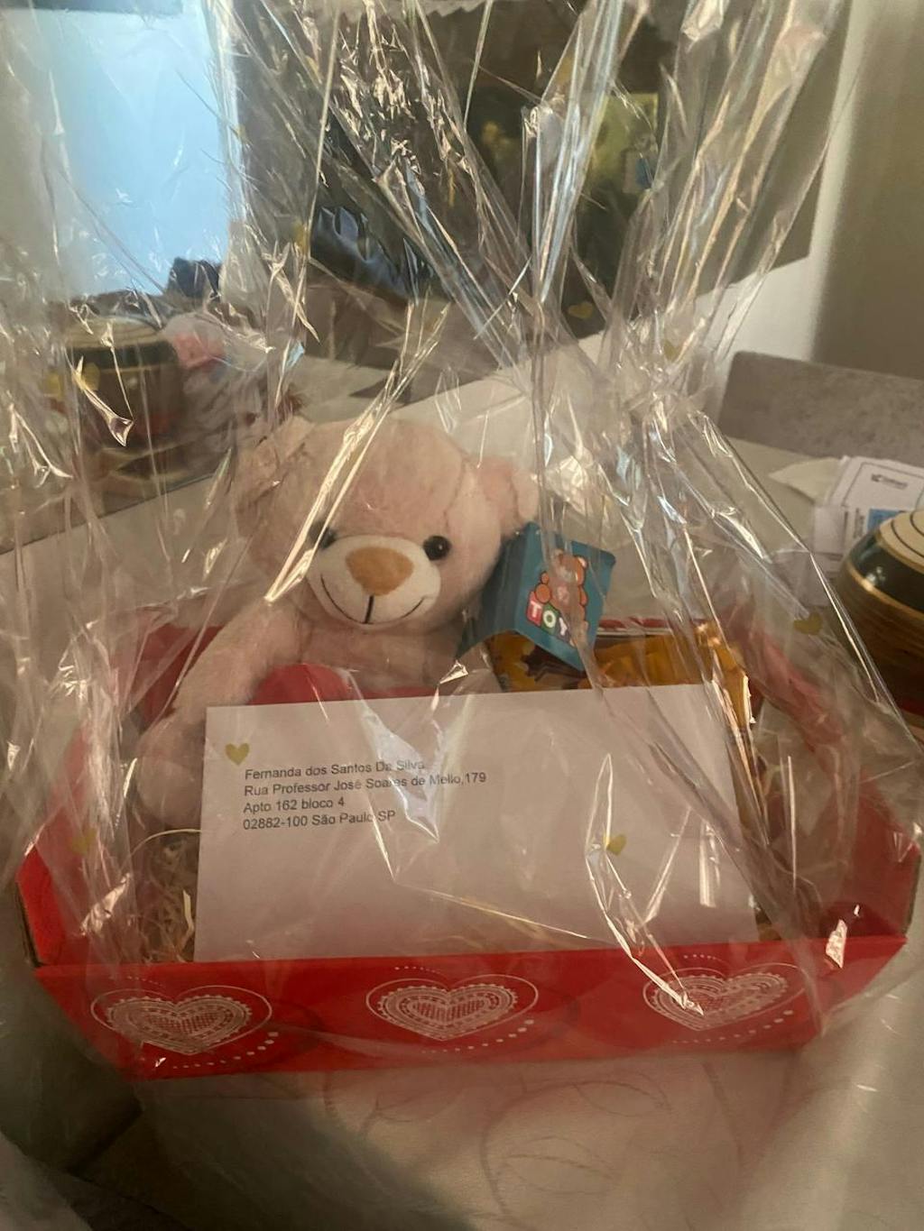 Cesta decorada para presente, contendo:  1 Bebida Láctea Toddynho Chocolate 200 ml, 1 Suco de Frutas Caixinha 200 ml, 1 Sache de Chá, 1 Pão de Mel Bauducco 30g, 1 Barra de Cereais 22g, 1 Goiabinha Bauducco 30g, 2 Sachês de Geléias 15g, 1 Sache de Mel 15g, 1 Sache de Margarina 10g, 1 Bolinho matinal de sabores diversos de 40g Bauducco, 1 club social, 3 Biscoito Bauducco 9g e uma Pelúcia de 20cm.