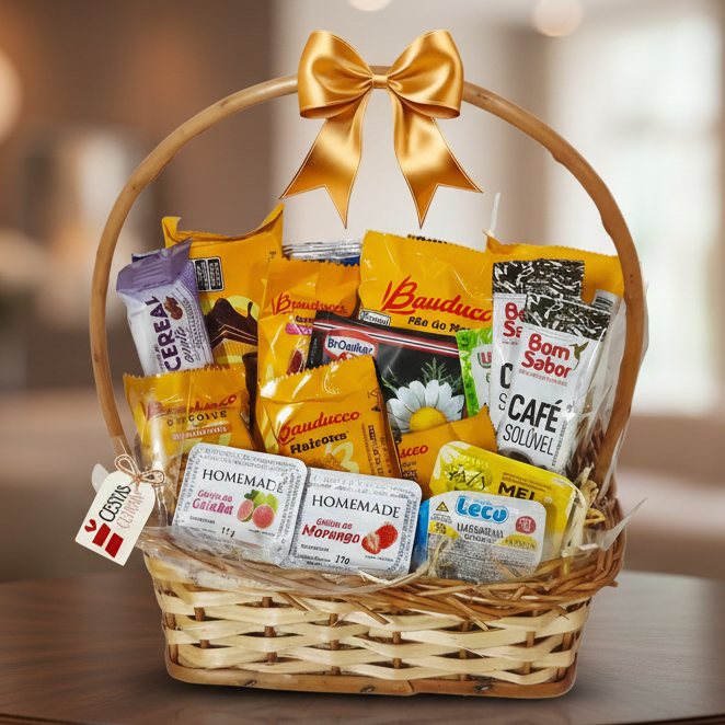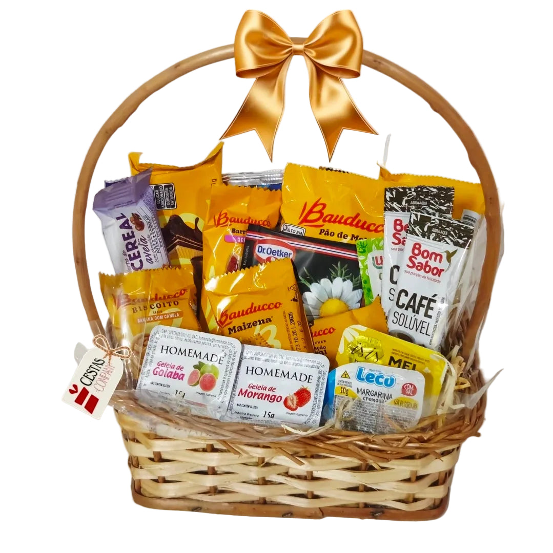 A Cesta Mimo com Delícias é um presente carinhoso e delicado: uma cesta de vime cuidadosamente decorada e embalada para presentear com deliciosos e selecionados produtos de marcas tradicionais e de qualidade. Um presente perfeito para um café da manhã ou lanche para uma pessoa, com variedade de itens para surpreender e encantar.