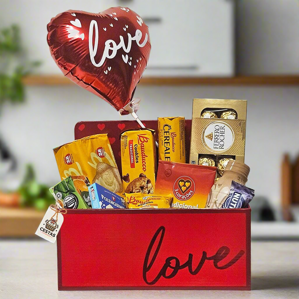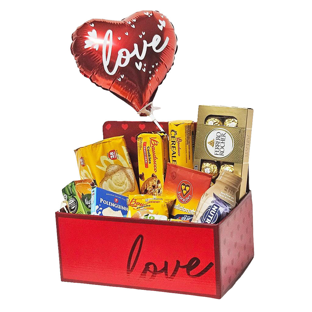 Cesta decorada para presente, contendo: Caixa personalizada, 1 Balão de Coração Love, 1 Pacote de Torrada Bauducco 142g, 1 Pacote Cookies Bauducco 60g, 1 Biscoito Cereale Bauducco 170g, 1 Caixa Ferrero Rocher 8un, 1 Suco Caixinha 200ml, 1 Bebida Lactea 270ml, 1 Queijo Polenguinho 68g, 1 Bolinho Bauducco 40g, 1 Drip Coffee, 2 Saches de Geleia 15g, 1 Sache Margarina 10g, 1 Sache de Mel 15g e 1 Barrinha de Cereal 22g