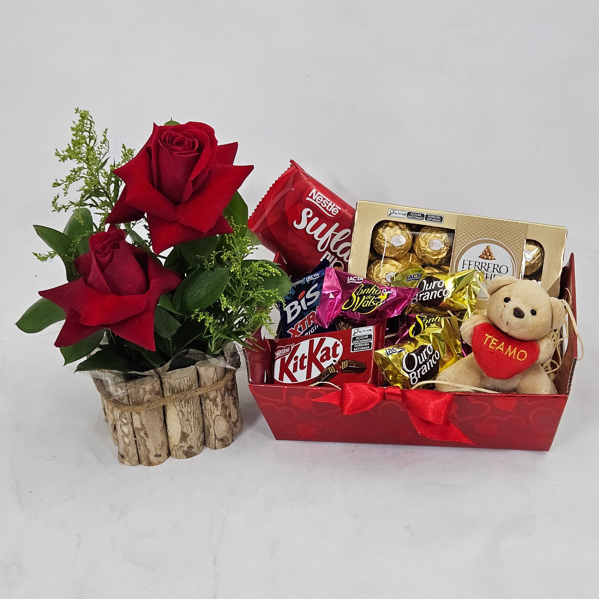Cesta recheada de chocolates com um ursinho romântico e um lindo arranjo com grandiosas rosas naturais importadas vermelhas. Esta cesta está disponível para entrega em todos os Bairros de São Paulo e em algumas cidades próximas. Veja disponibilidade ao informar o endereço de entrega. Aproveite para agendar hoje esta surpresa encantadora!