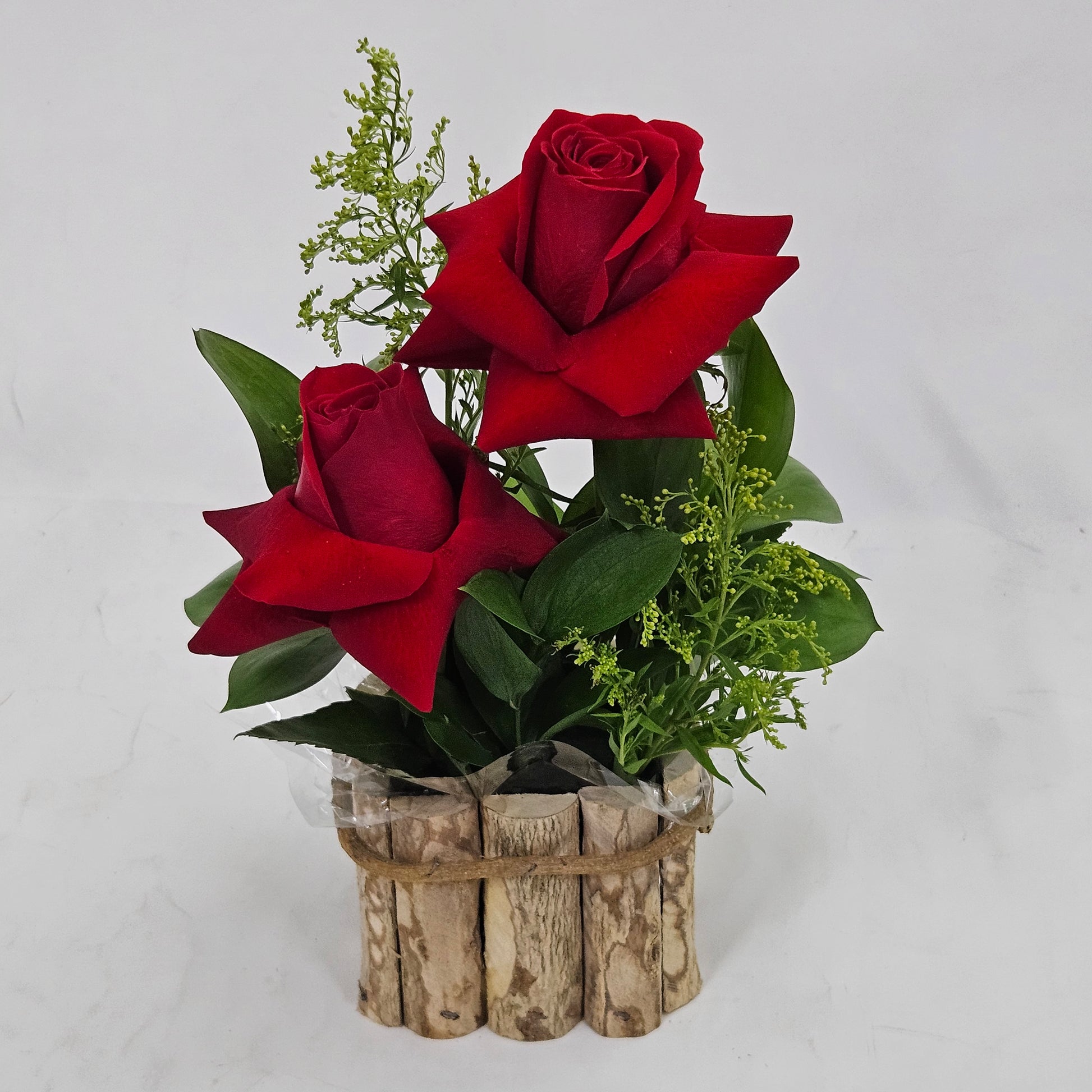 Arranjo em cachepot de madeira com 2 Rosas Naturais importadas.