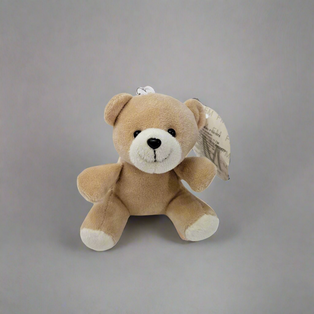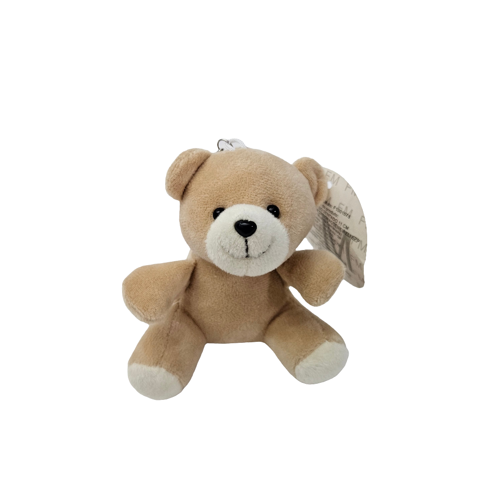 Carinhoso ursinho de pelúcia pequeno (13 cm de altura), tipo chaveiro, em tons de bege.