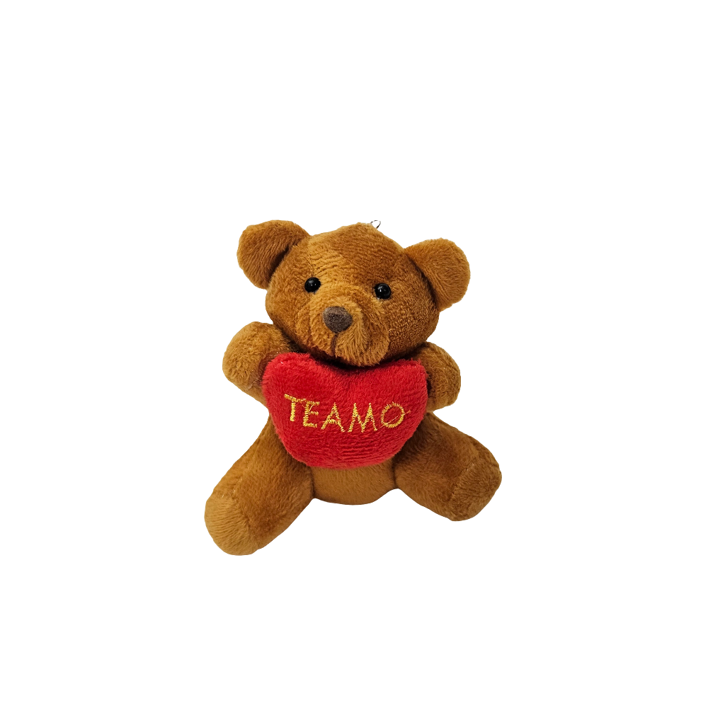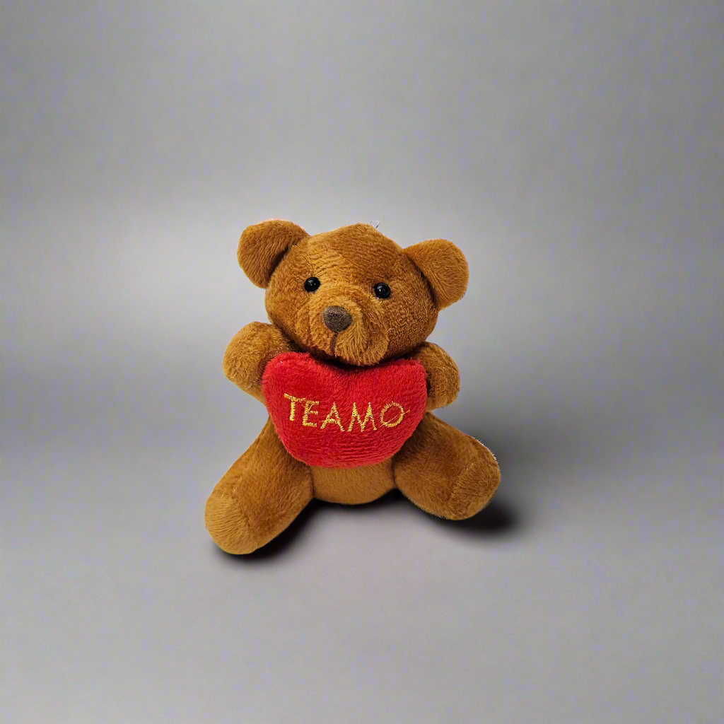 Carinhoso ursinho de pelúcia pequeno (11 cm de altura), tipo chaveiro, com coração vermelho e inscrição "Te Amo". Cores diversas.